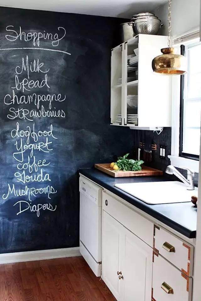 廚房里裝個(gè)黑板墻,不知道是不是玩出新高度的一種,既可以學(xué)習(xí),又可以安利各種菜單。有沒有覺得很不錯(cuò)啊,隨手來(lái)個(gè)幾筆,無(wú)論大人小孩都愛上這里。